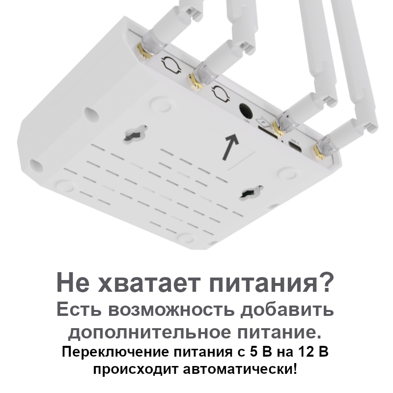 Подключение модема к внешней антенне осуществляется через разъёмы на торцевой вставке корпуса. Подключение модема внутри осуществляется с помощью четырёх пигтейлов с разъёмами MHF4(IPEX4) для модемов M.2. Разъём антенн 50 Ом SMA-female.